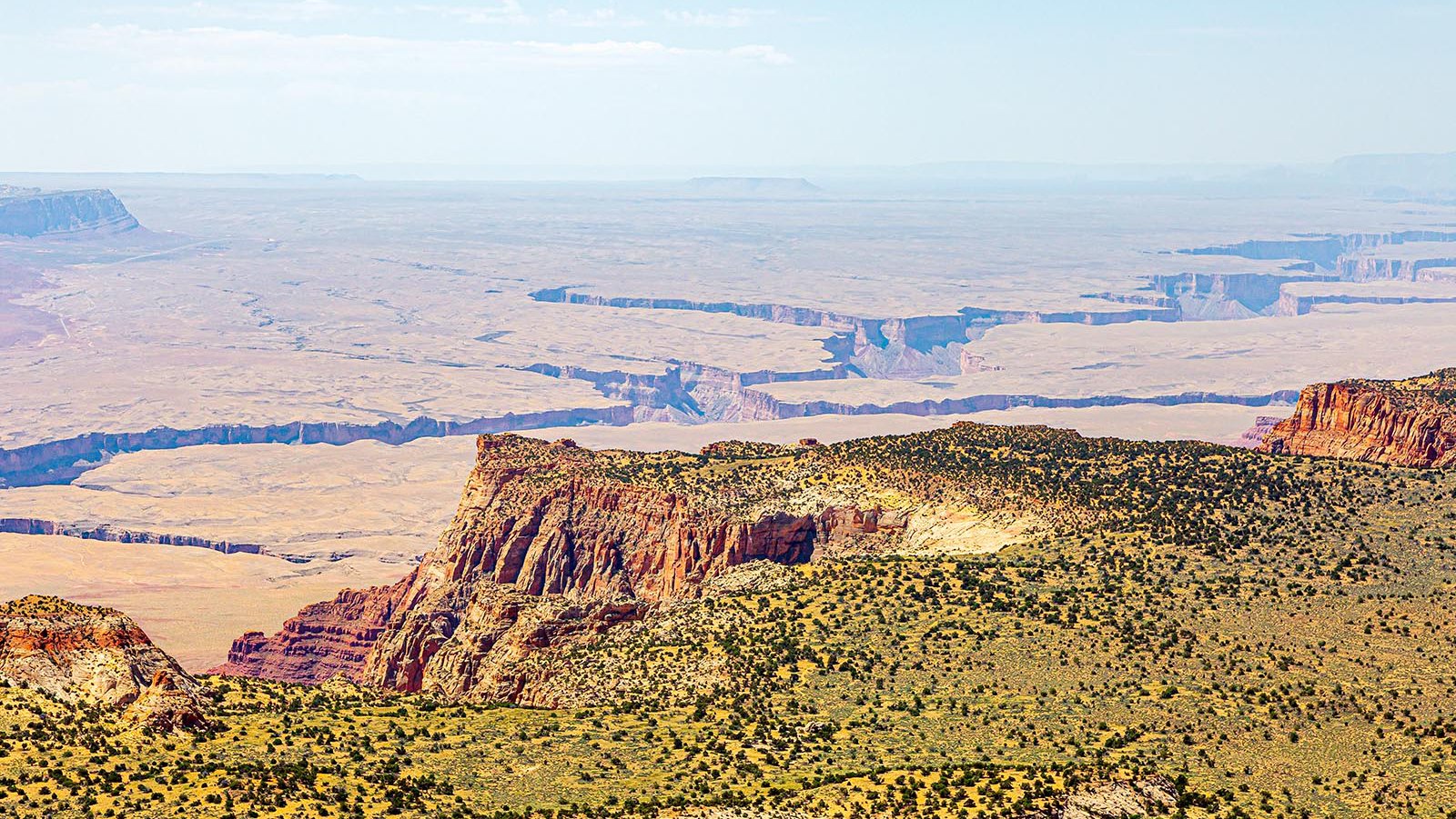 The dramatic transition from the flat, scrub-covered plateau into the deep canyon cuts, illustrates how elevation changes contribute to the diverse microclimates found throughout Grand Canyon National Park.