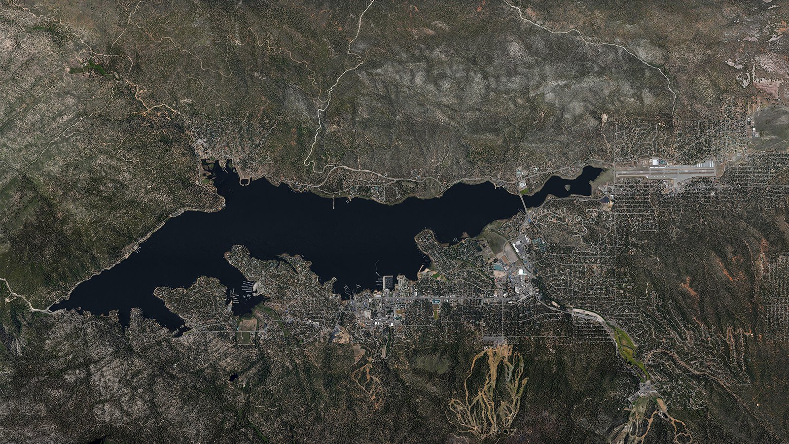 Aerial view of Big Bear Airport framed by Big Bear Lake and surrounded by the communities of Big Bear Lake and Big Bear City.