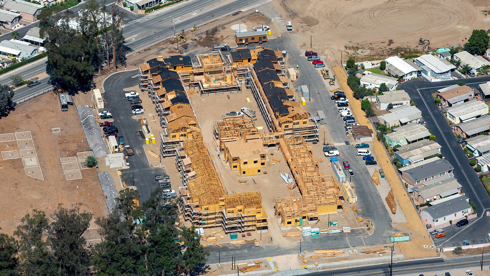 Ongoing construction of a residential apartment complex in Oxnard, California, featuring a close-up oblique view that highlights the intricate wooden framing and the dark, sleek black roofs that are being installed on a section of the building complex.