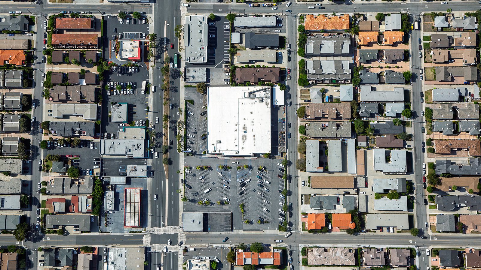 Vertical aerial photograph of a large white commercial building and parking lot surrounded by densely packed single-family homes and apartment complexes.