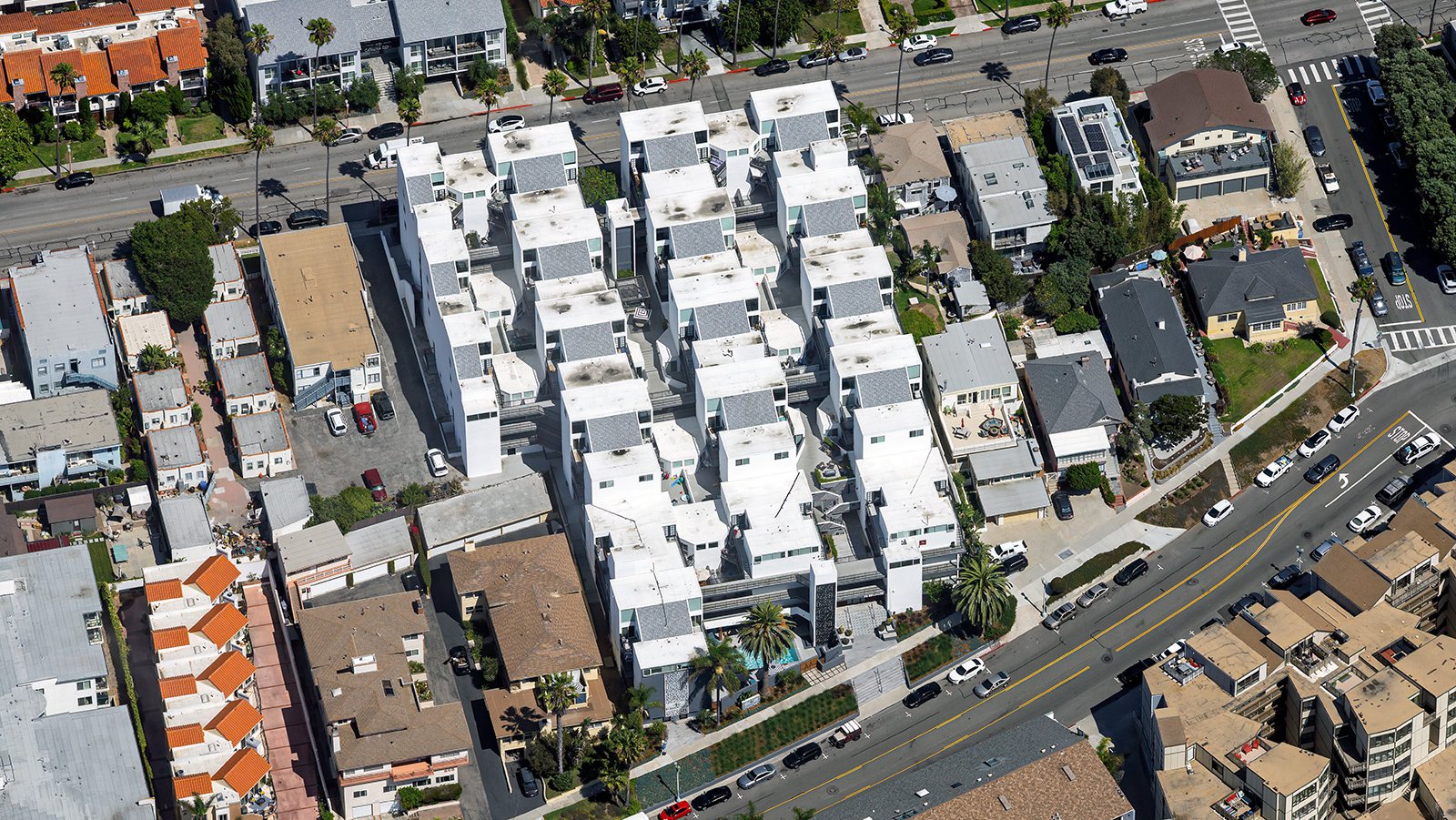 Close-up oblique aerial photo of modern apartment community with white, block-like architecture, surrounded by older, traditional residential buildings.