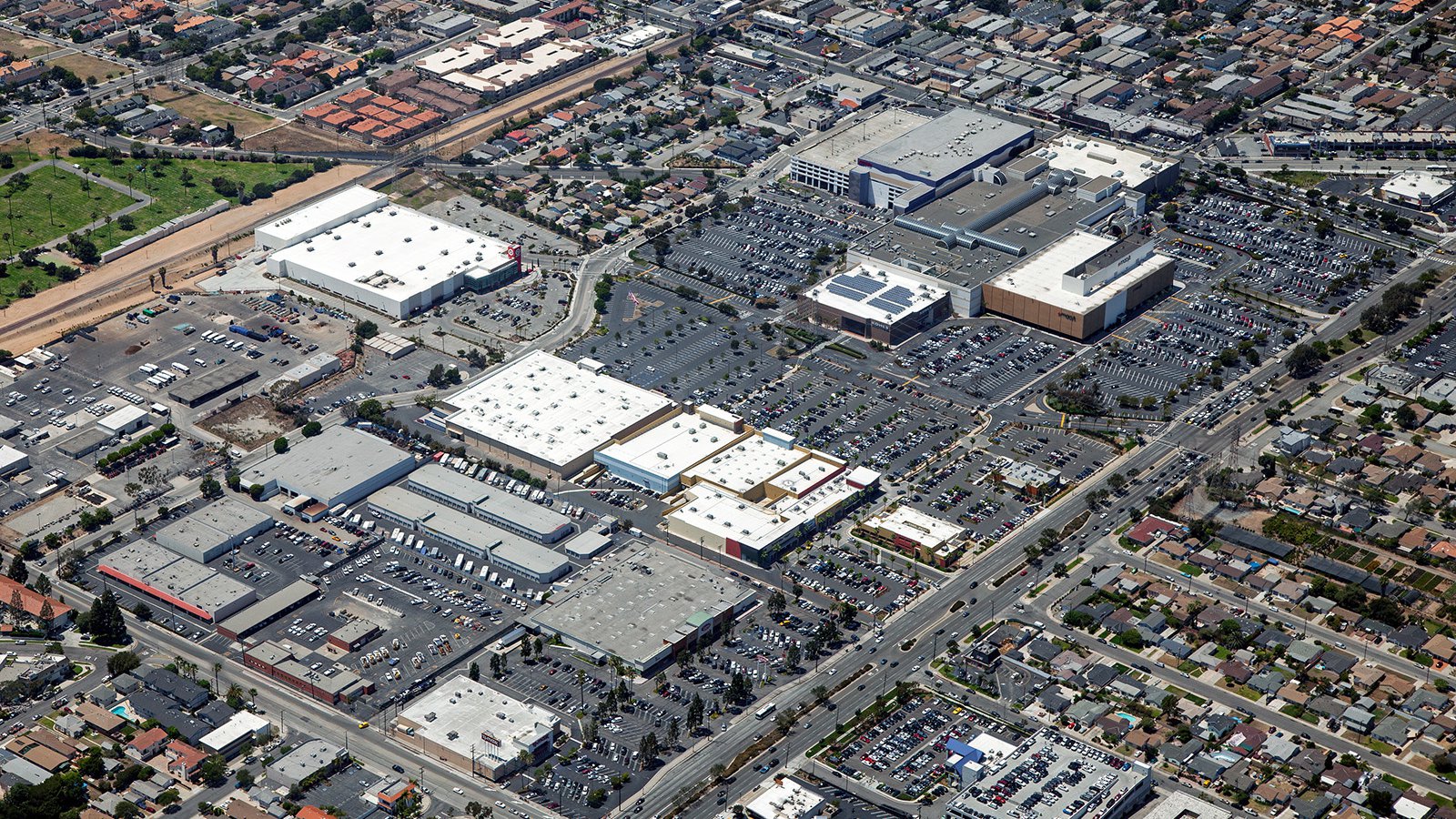 High-altitude aerial photograph showing nearly full parking lots at the South Bay Galleria Shopping Center.