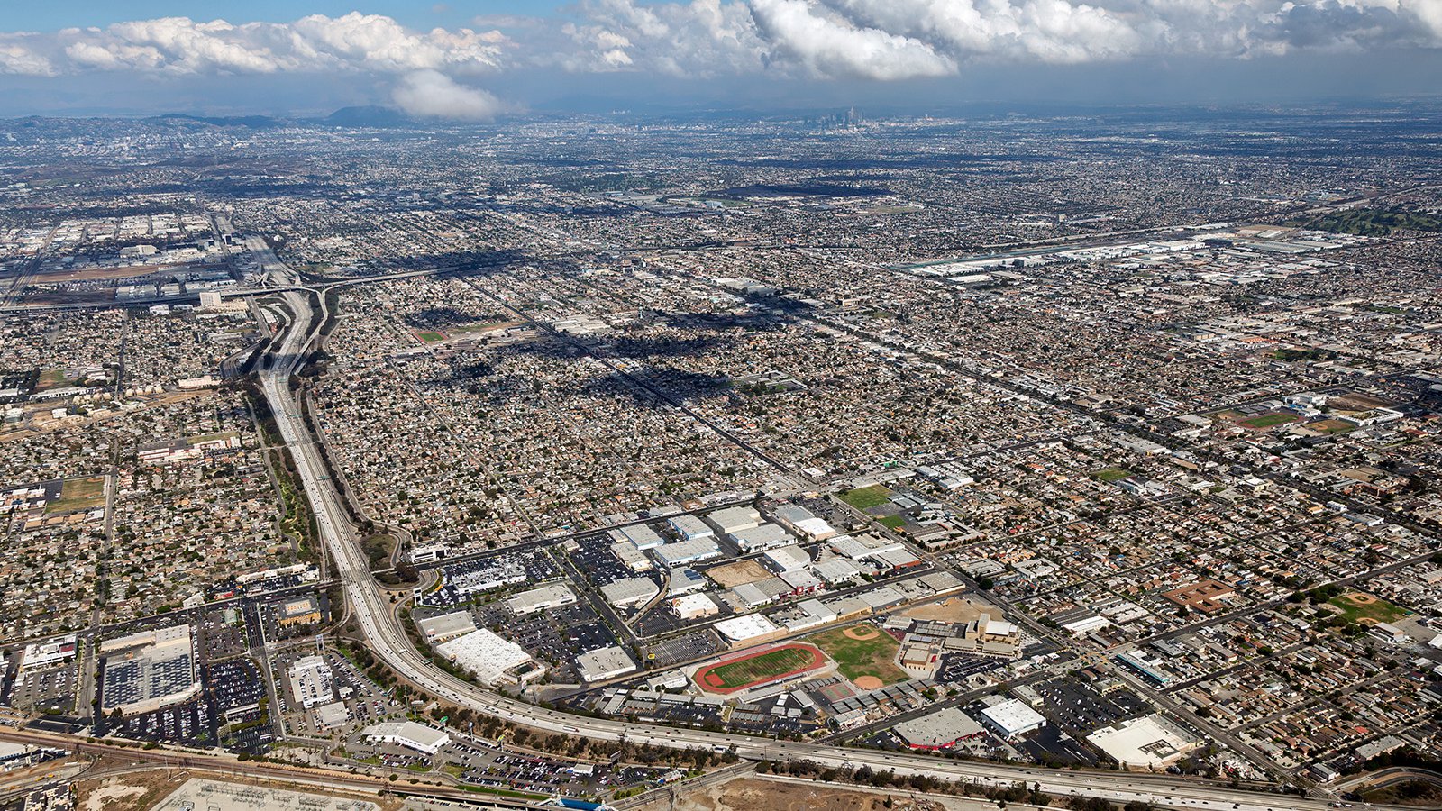 Wide aerial cityscape of the Los Angeles basin showing freeways, commercial buildings, and endless urban development stretching to the distant horizon.