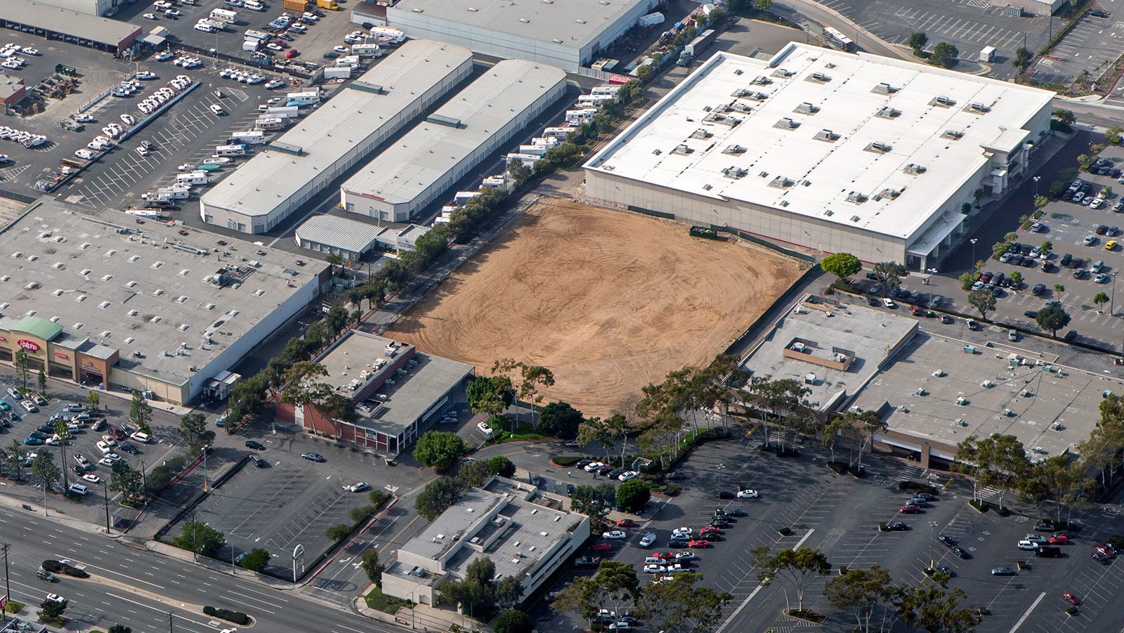 Oblique aerial view of a commercial area with multiple large stores and a prominent parcel of cleared land ready for construction.