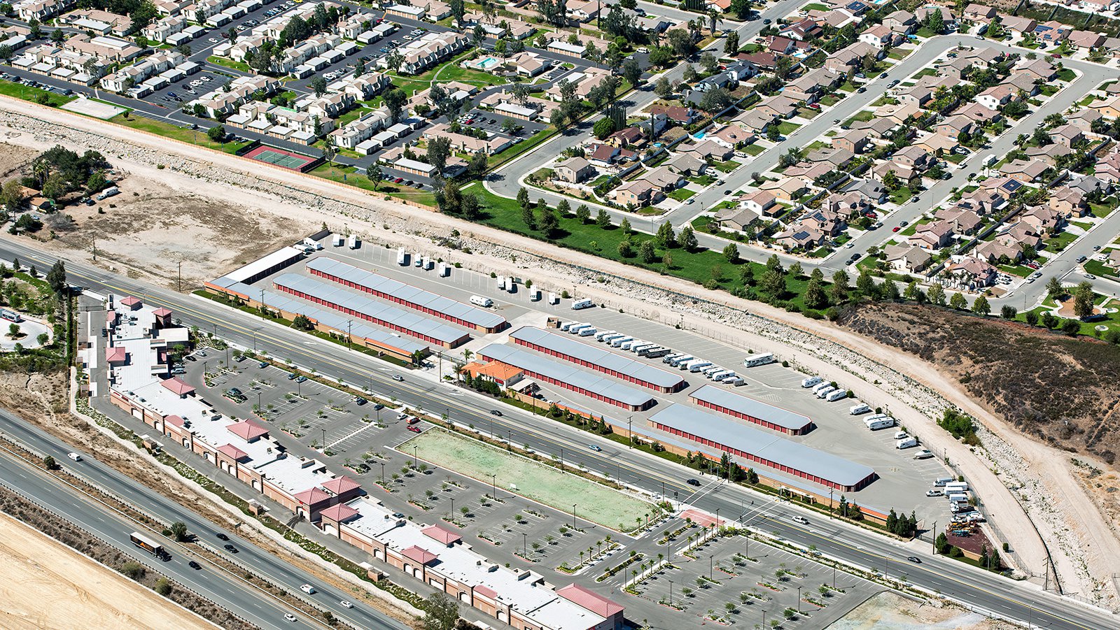 A modern commercial complex featuring a large self-storage facility and retail space, complete with ample parking and RV storage.
