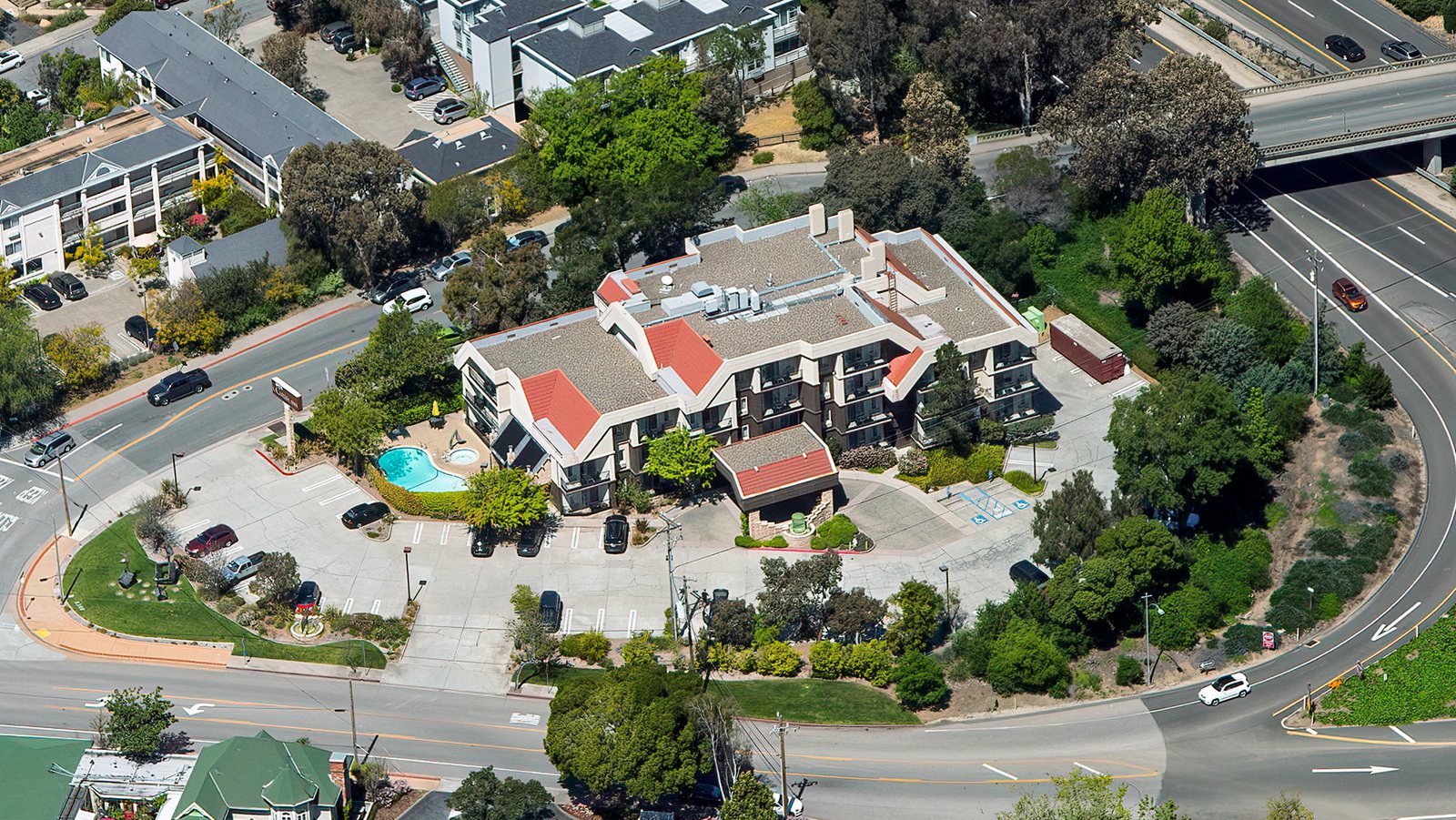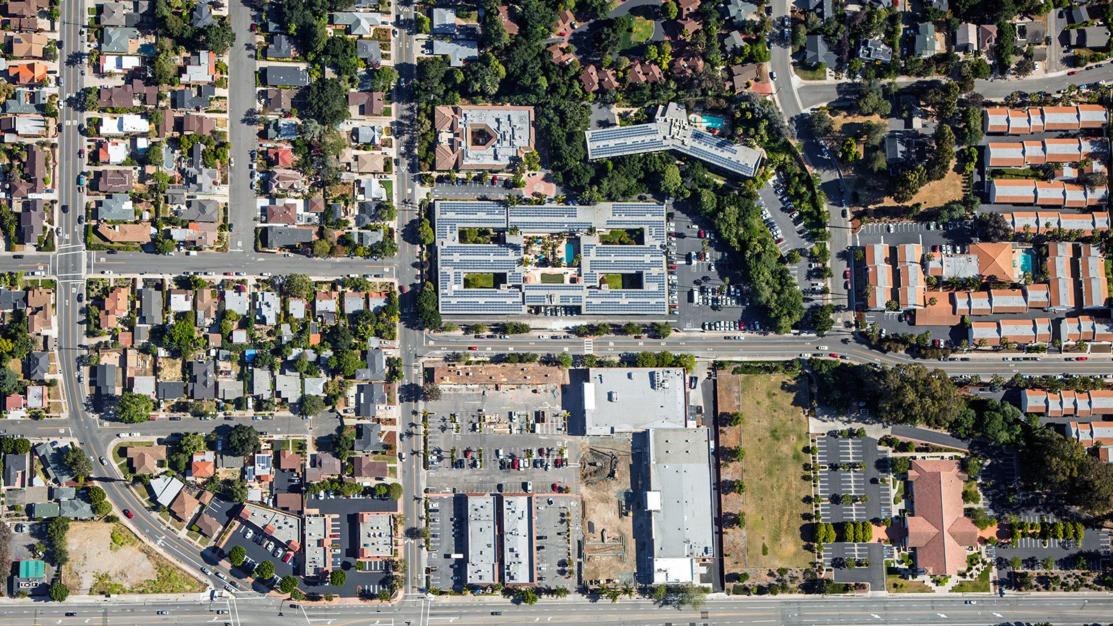 Vertical view of a large, multi-wing residential complex capped with solar panels in San Luis Obispo, Calfiornia.