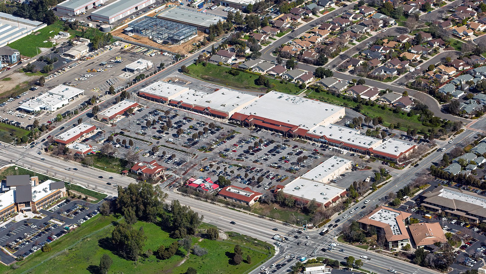 Oblique aerial view of Marigold Center, a large commercial shopping center located in the south side of town.