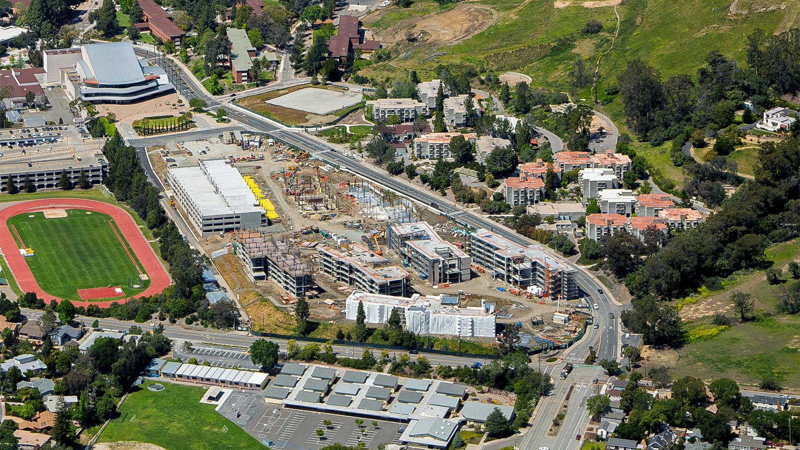 Aerial view of a large construction site on the Cal Poly SLO campus where new student housing and the future Cal Poly Welcome Center begin to take shape.